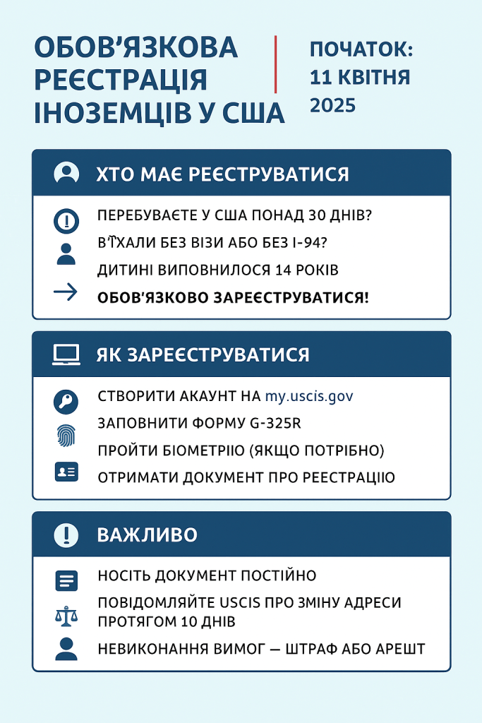 З 11 квітня 2025 року в США запроваджується нова імміграційна вимога: усі іноземці, які перебувають у країні понад 30 днів, повинні пройти обов’язкову реєстрацію через USCIS, навіть якщо вони не мають візи або перебувають у США без статусу.