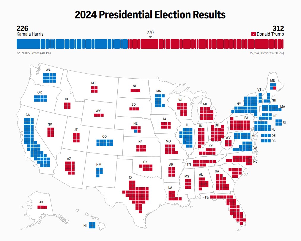 Дональд Трамп, кандидат від Республіканської партії, переміг на президентських виборах, отримавши 312 голосів виборників, тоді як його опонентка, демократка Камала Гарріс, здобула 226 голосів.